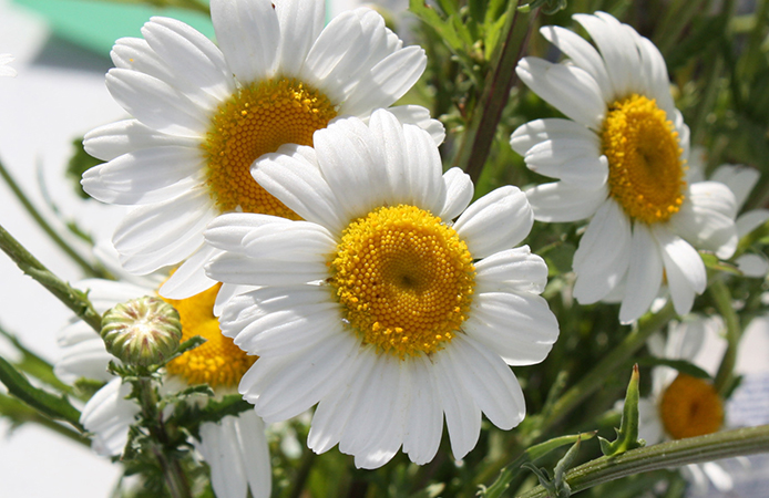 Scentless chamomile is the more common of the three. It has thread-like leaves. The single stems branch about halfway up and the flowers tend to be all at the same height, forming a flattish inflorescence.